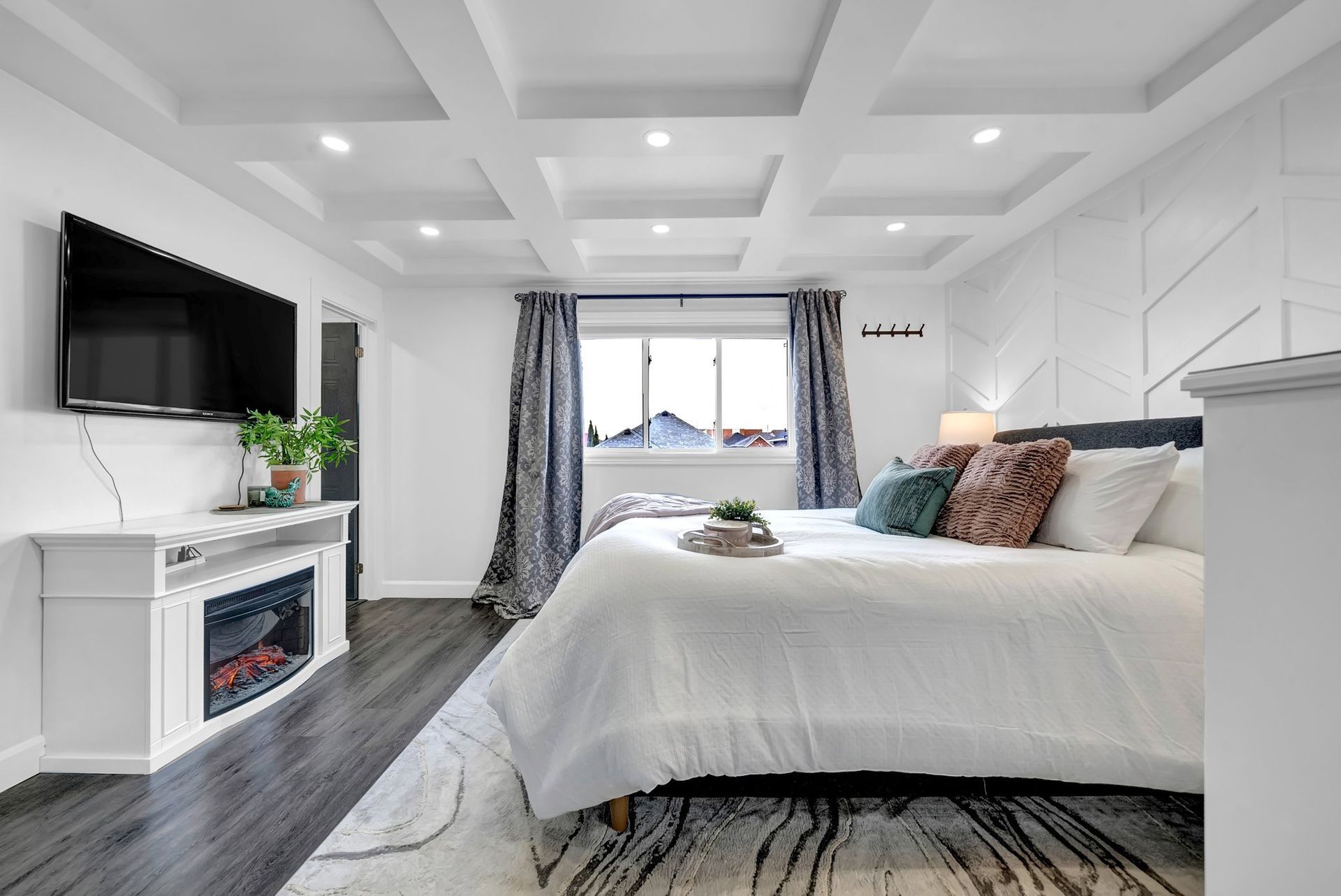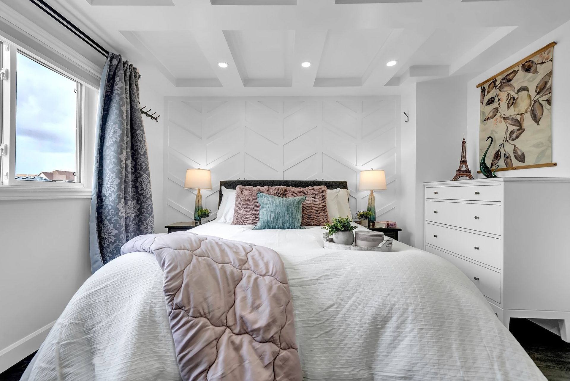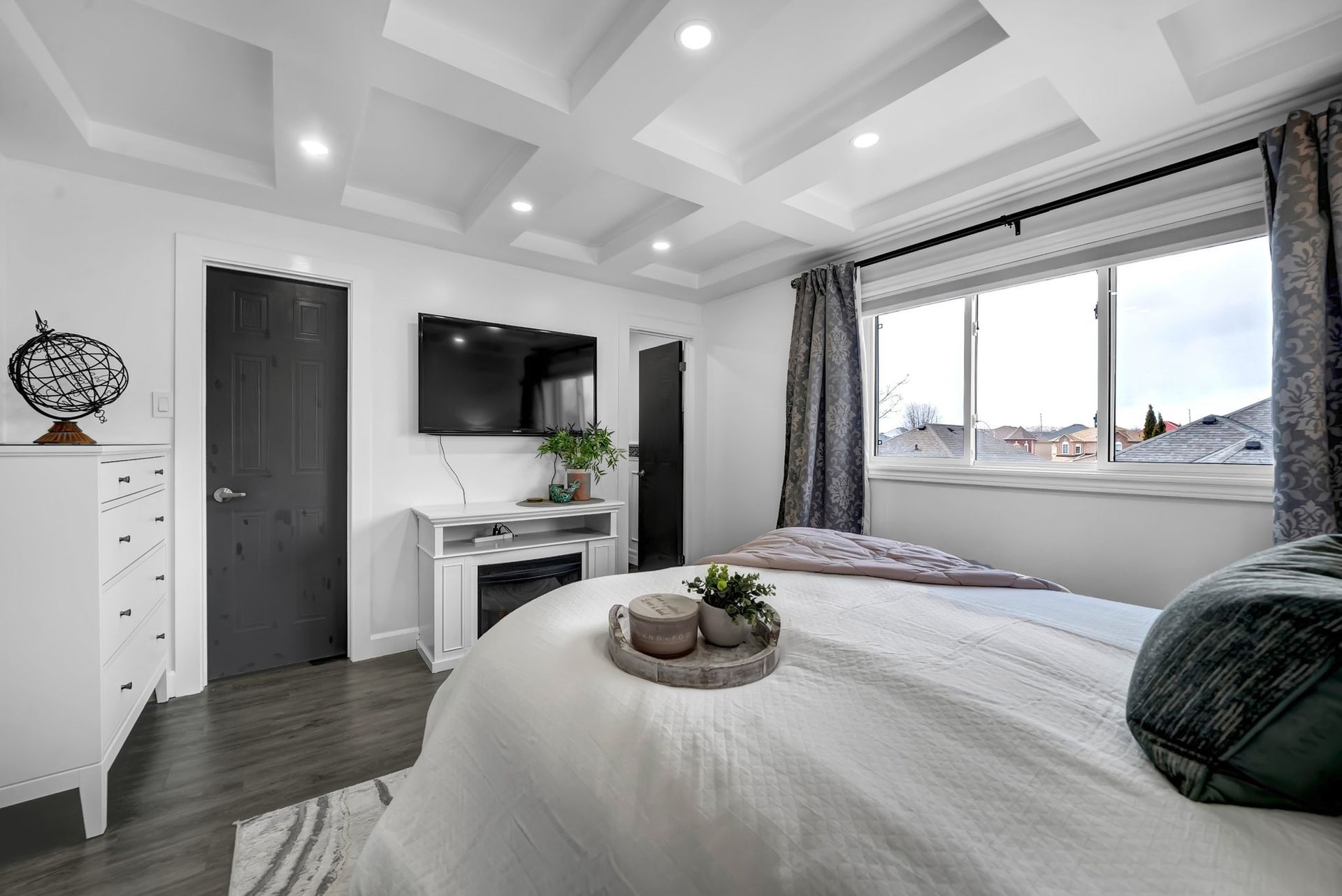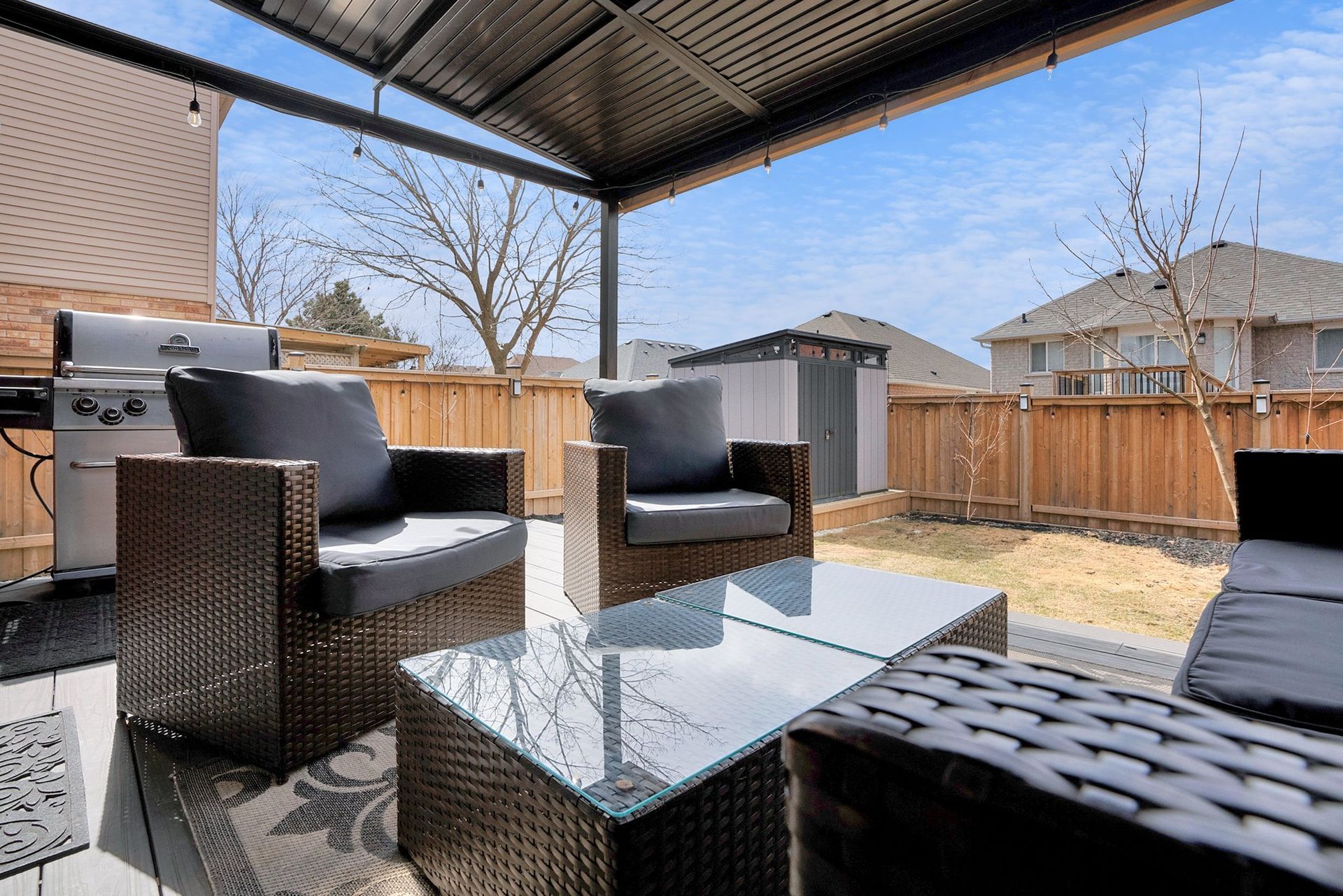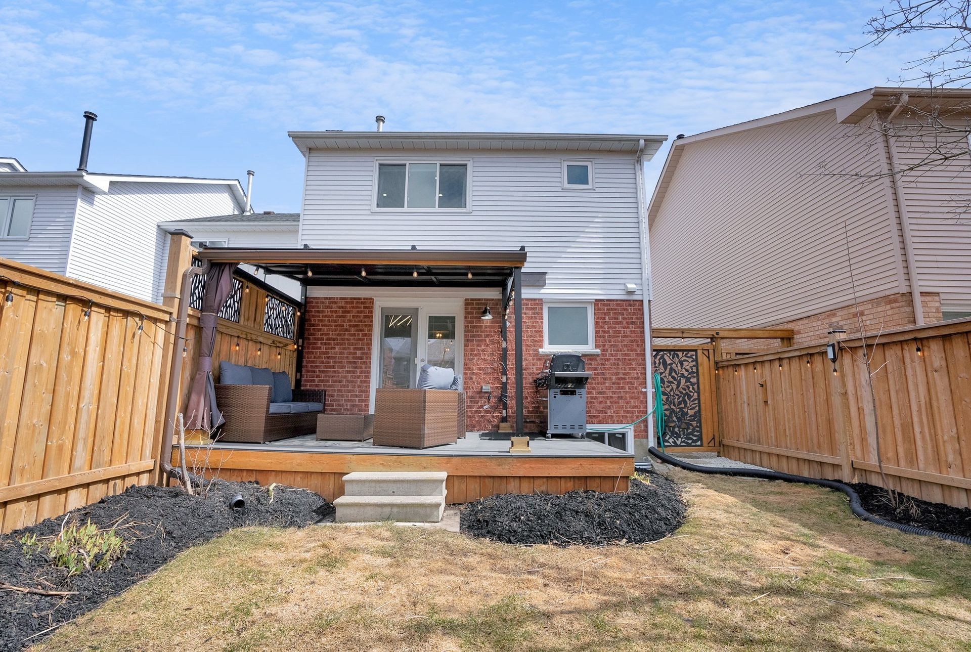The fully fenced backyard offers privacy & space, ideal for relaxing or grilling with a natural gas BBQ. Upstairs, the primary bedroom feels like a true retreat. With a striking feature wall, coffered ceilings, & a spacious walk-in closet. The private three-piece ensuite adds to the serenity. Two additional spacious bedrooms offer ample closet space & large windows, perfect for families.
