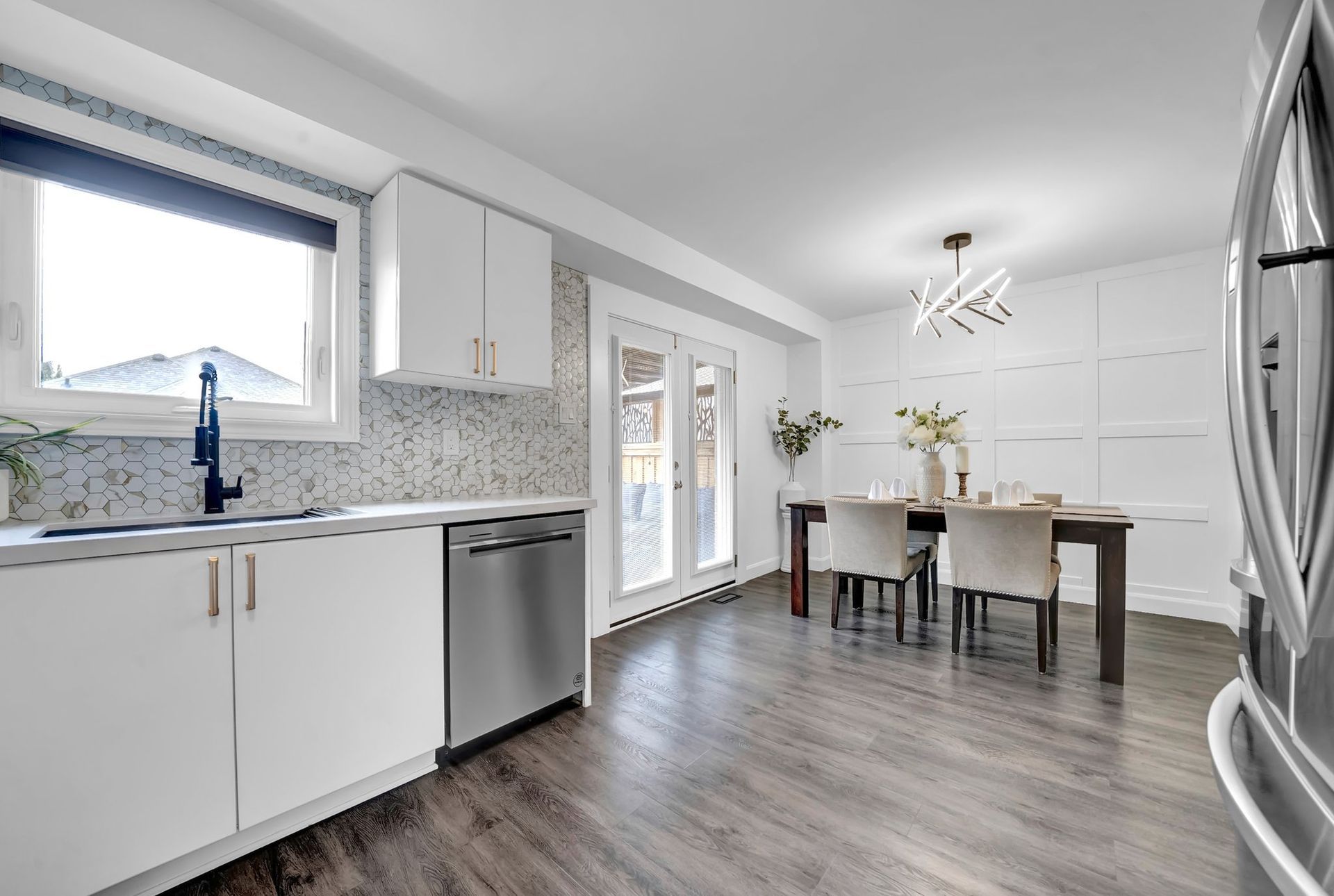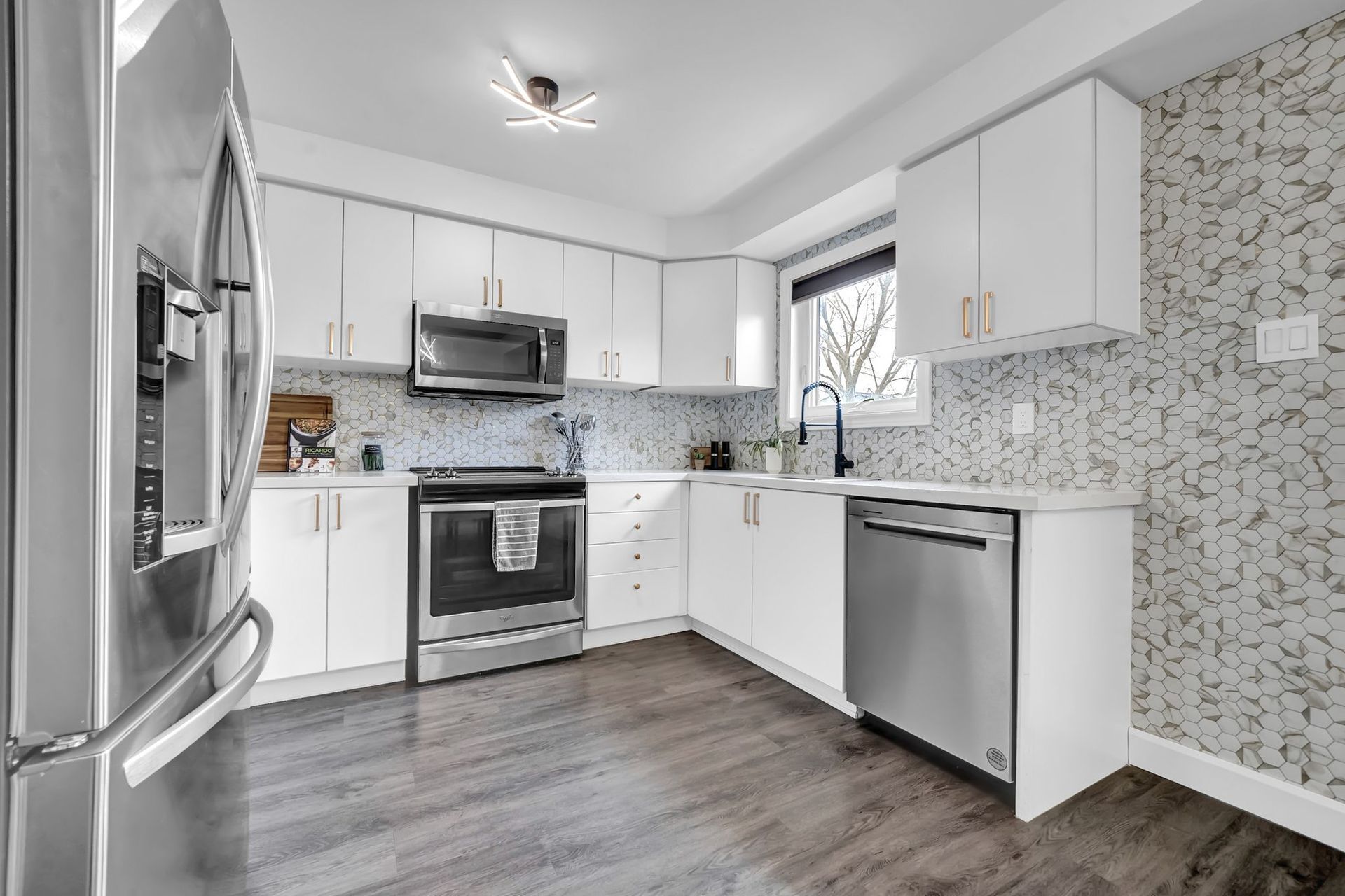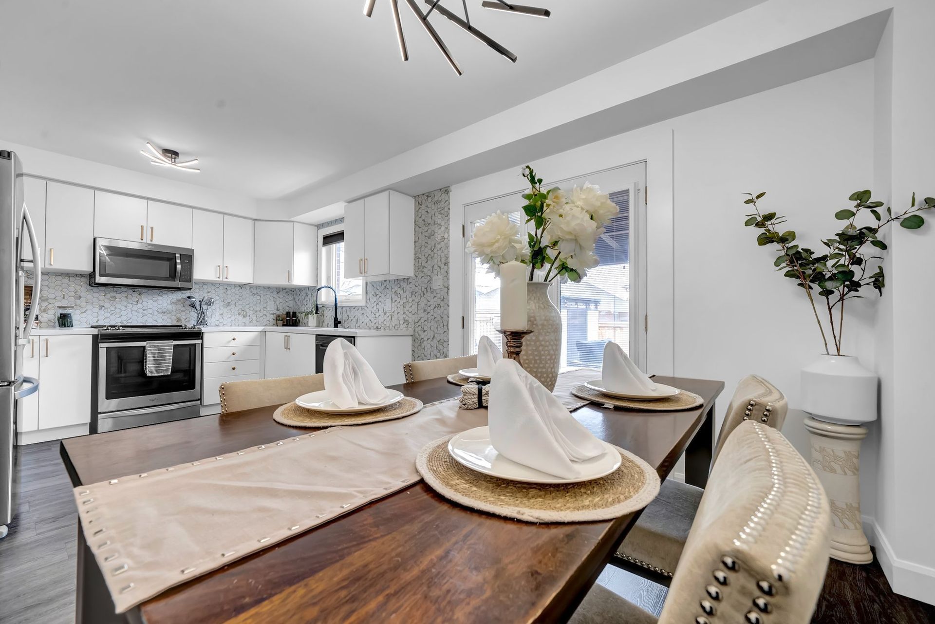 The main floor features a bright living & dining room with large windows, flooding the space with natural light. The updated eat-in kitchen is perfect for family meals or hosting guests, with sleek stainless steel appliances, quartz countertops, undermount sink, & a walkout to a composite deck with a gazebo.