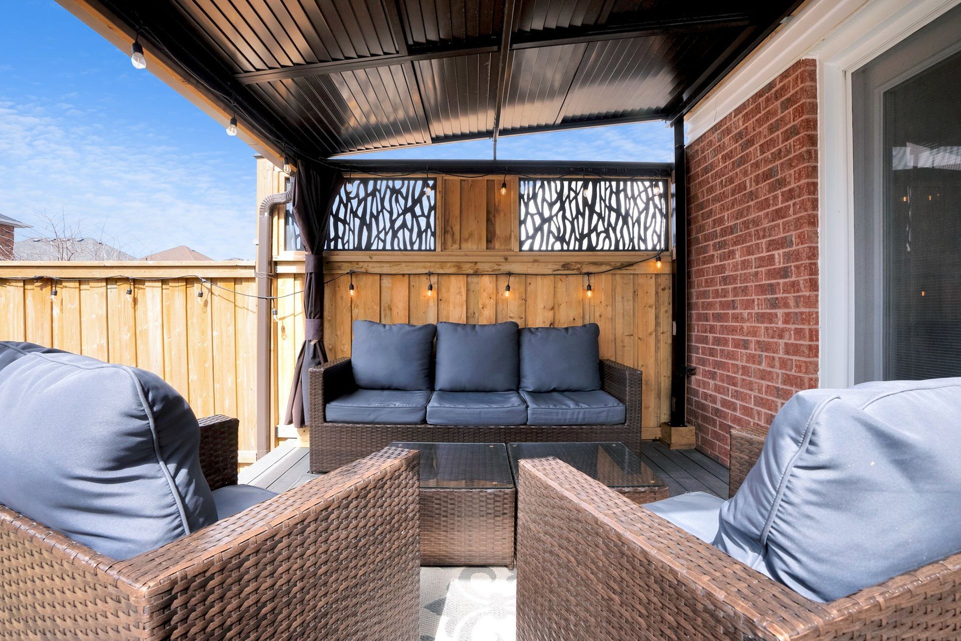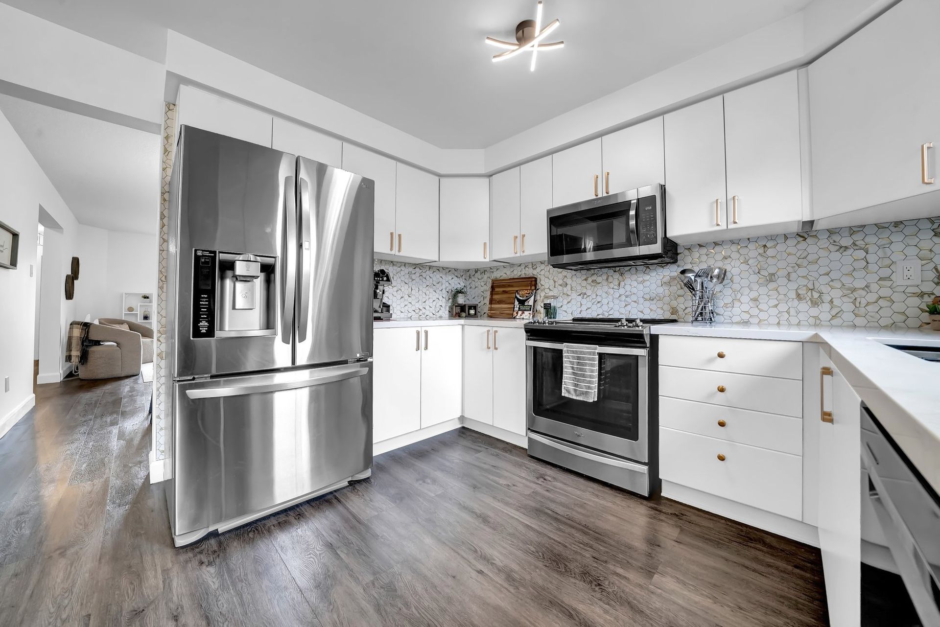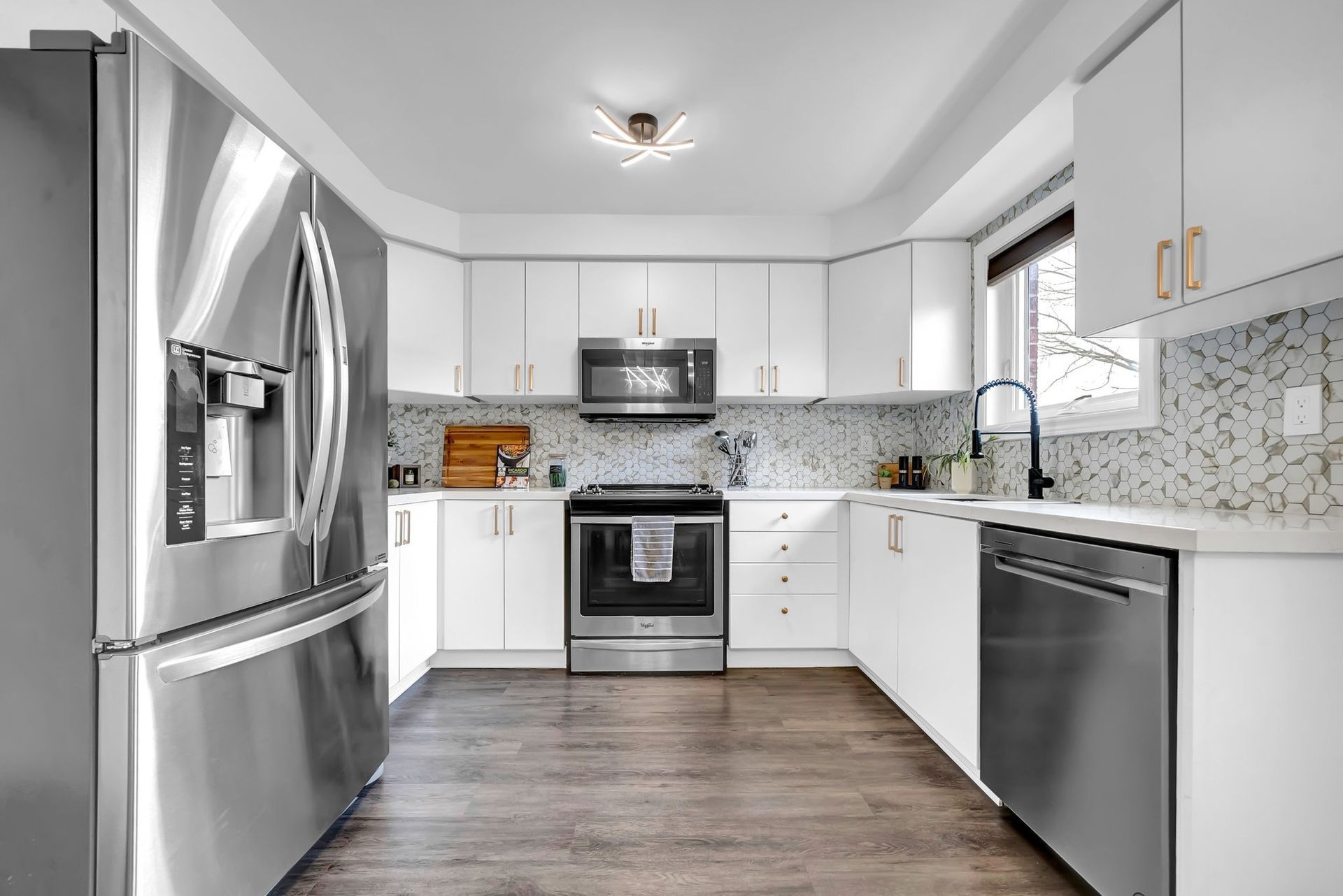 The main floor features a bright living & dining room with large windows, flooding the space with natural light. The updated eat-in kitchen is perfect for family meals or hosting guests, with sleek stainless steel appliances, quartz countertops, undermount sink, & a walkout to a composite deck with a gazebo.