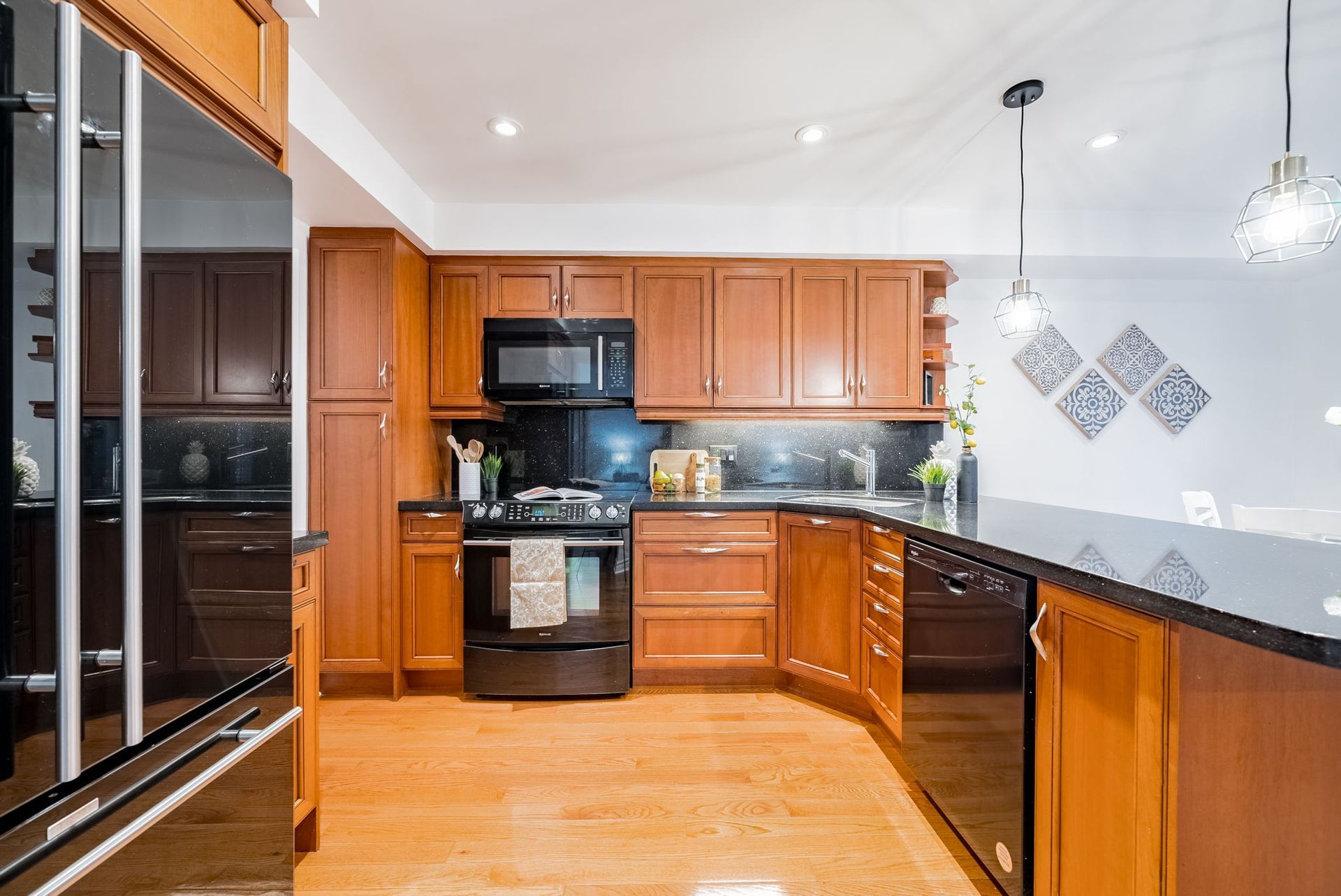 The heart of the home is the open-concept eat-in kitchen, designed with granite countertops, high-end appliances, and a seamless connection to the bright family room. A cozy gas fireplace anchors the space, while large windows and a walkout lead to a private fully fenced backyard retreat.