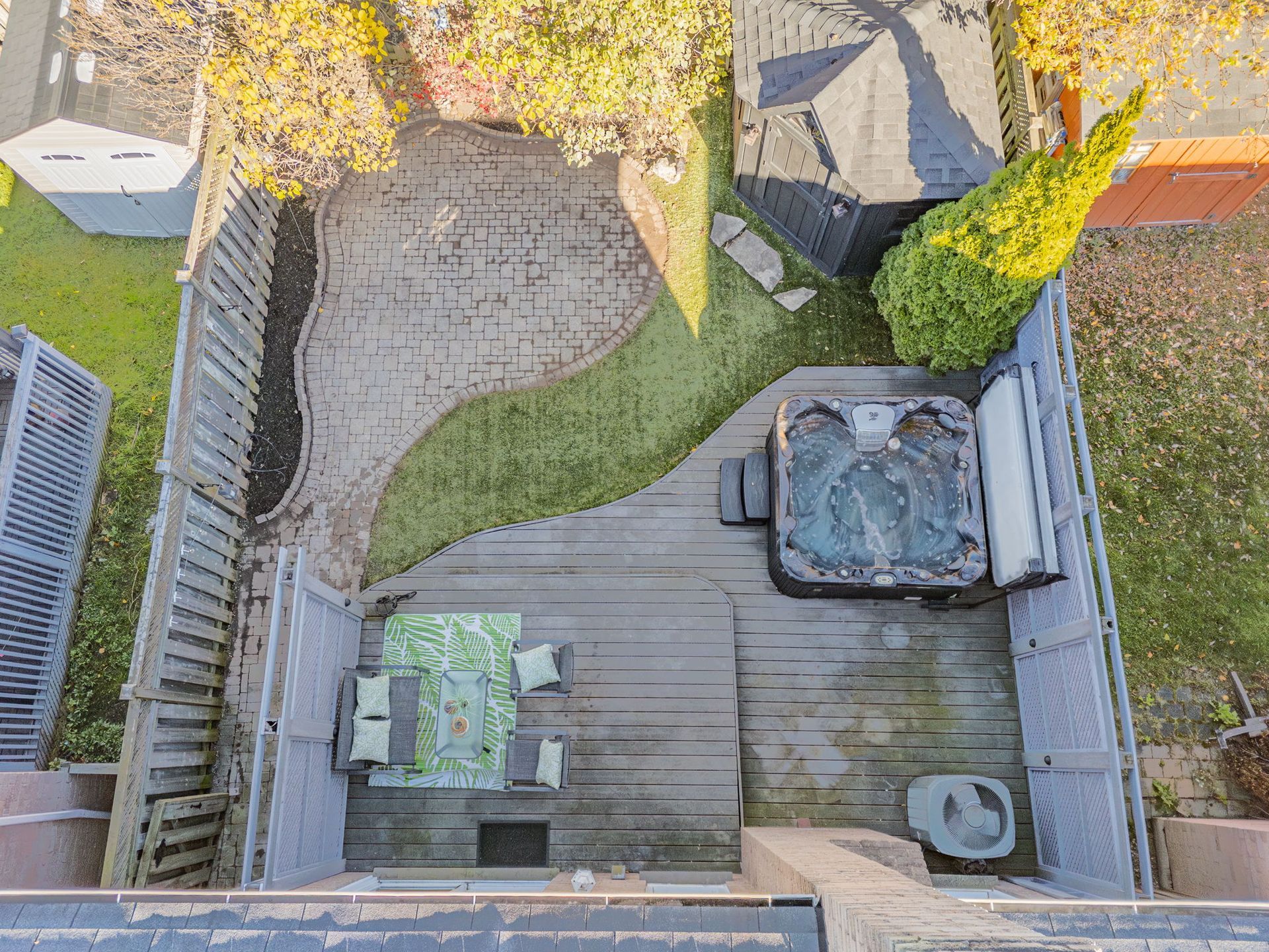 This outdoor oasis features a maintenance-free lawn, a composite deck, a six-person hot tub, custom wood shed/change room, and professionally landscaped perennial gardens, creating a perfect space for relaxation and entertaining.
