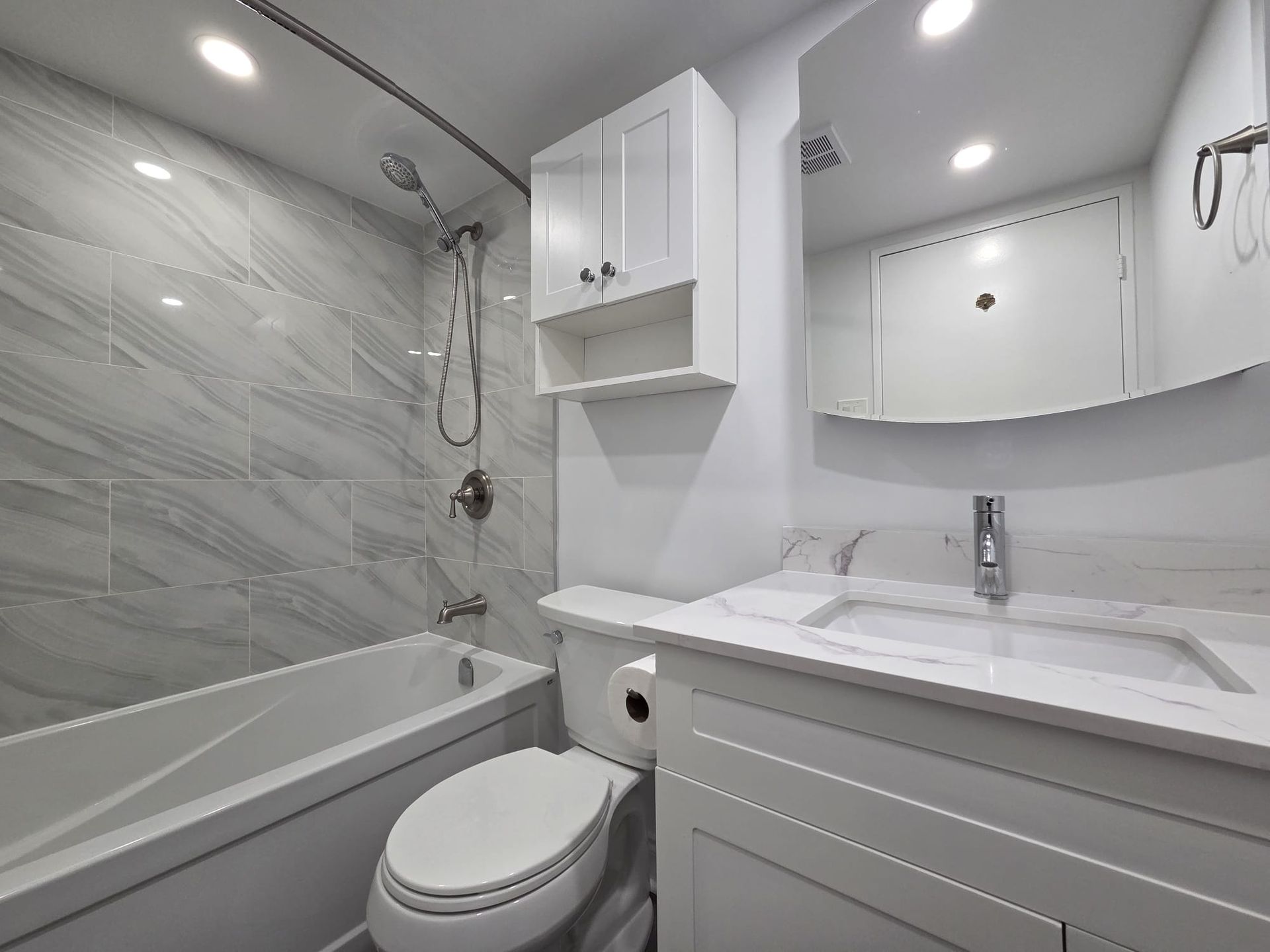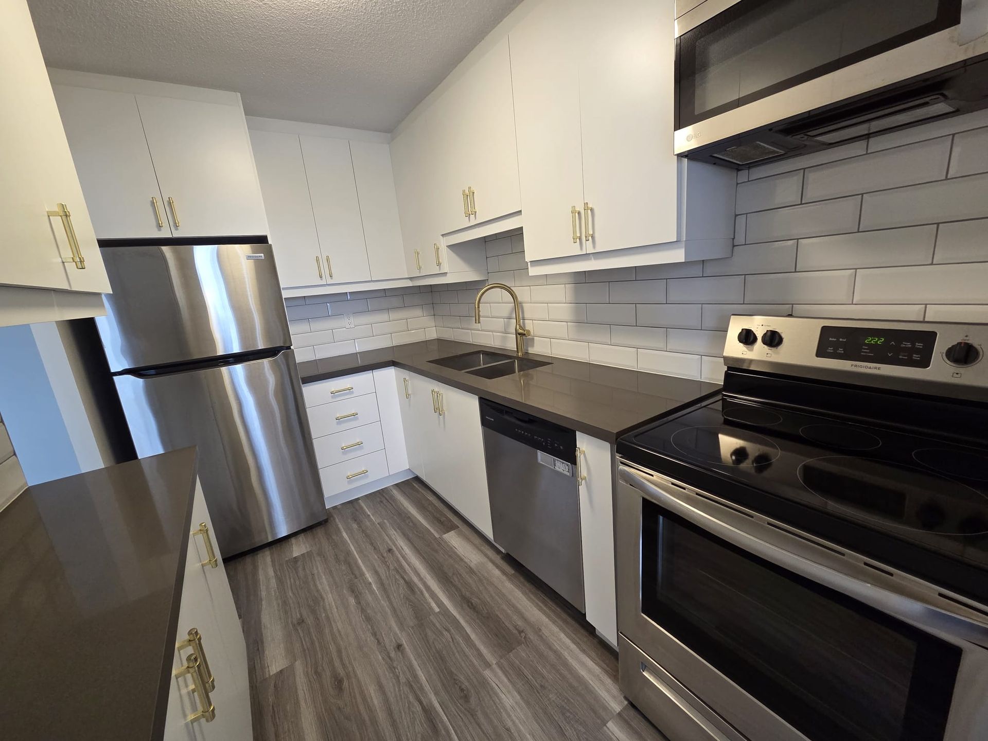 The renovated kitchen boasts new flooring, stainless steel appliances, stone countertops, and a sleek backsplash, flowing into the open-concept living/dining area with a walkout to a South facing covered balcony perfect for year-round BBQs or relaxing outdoors.