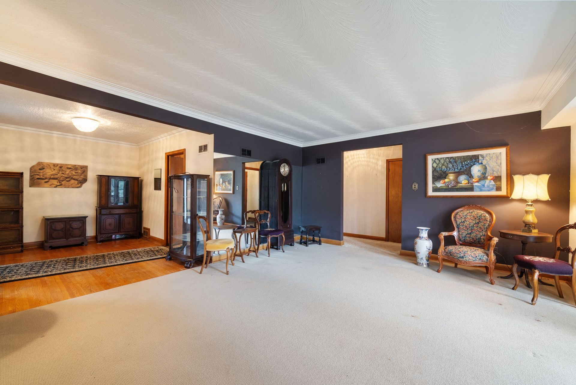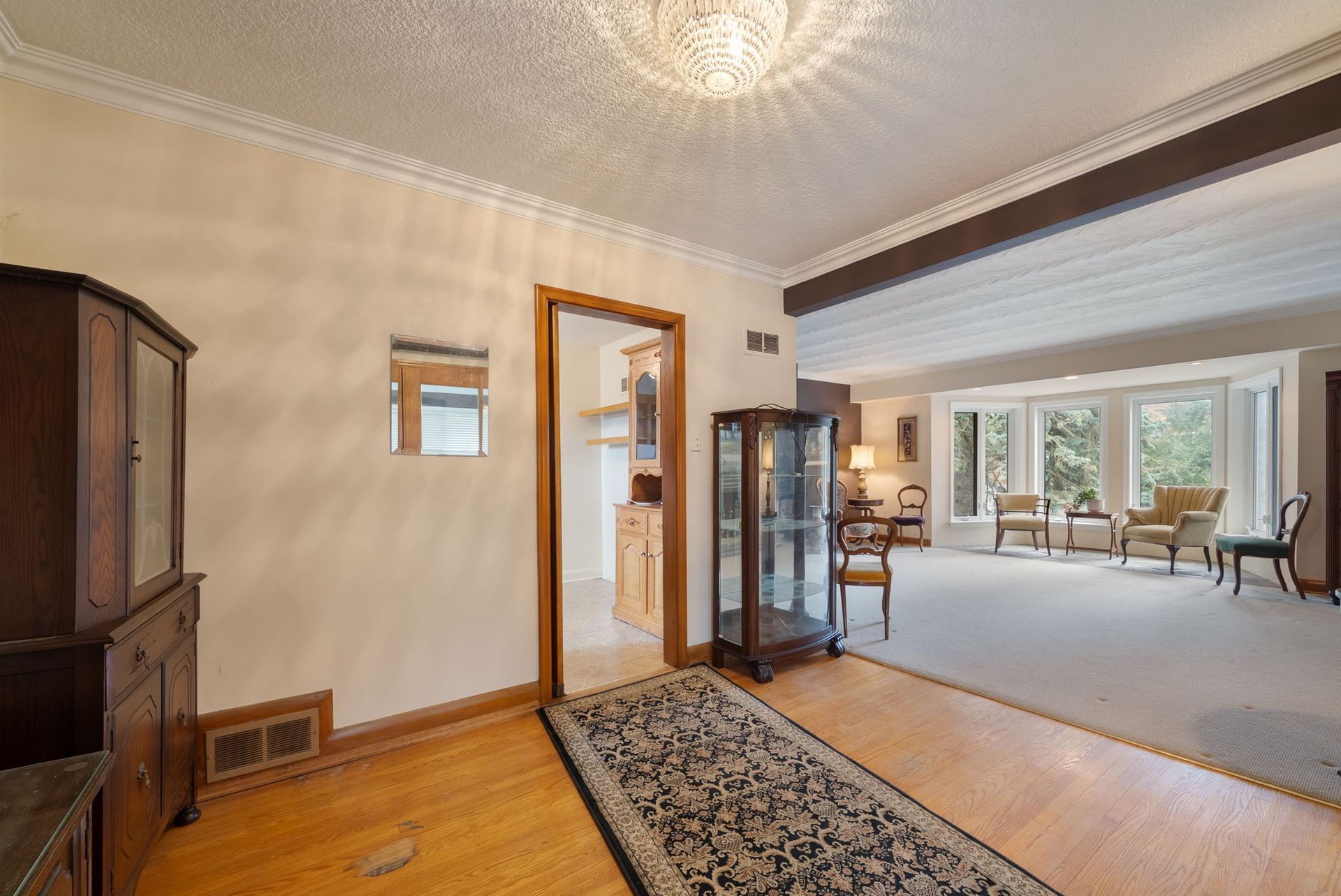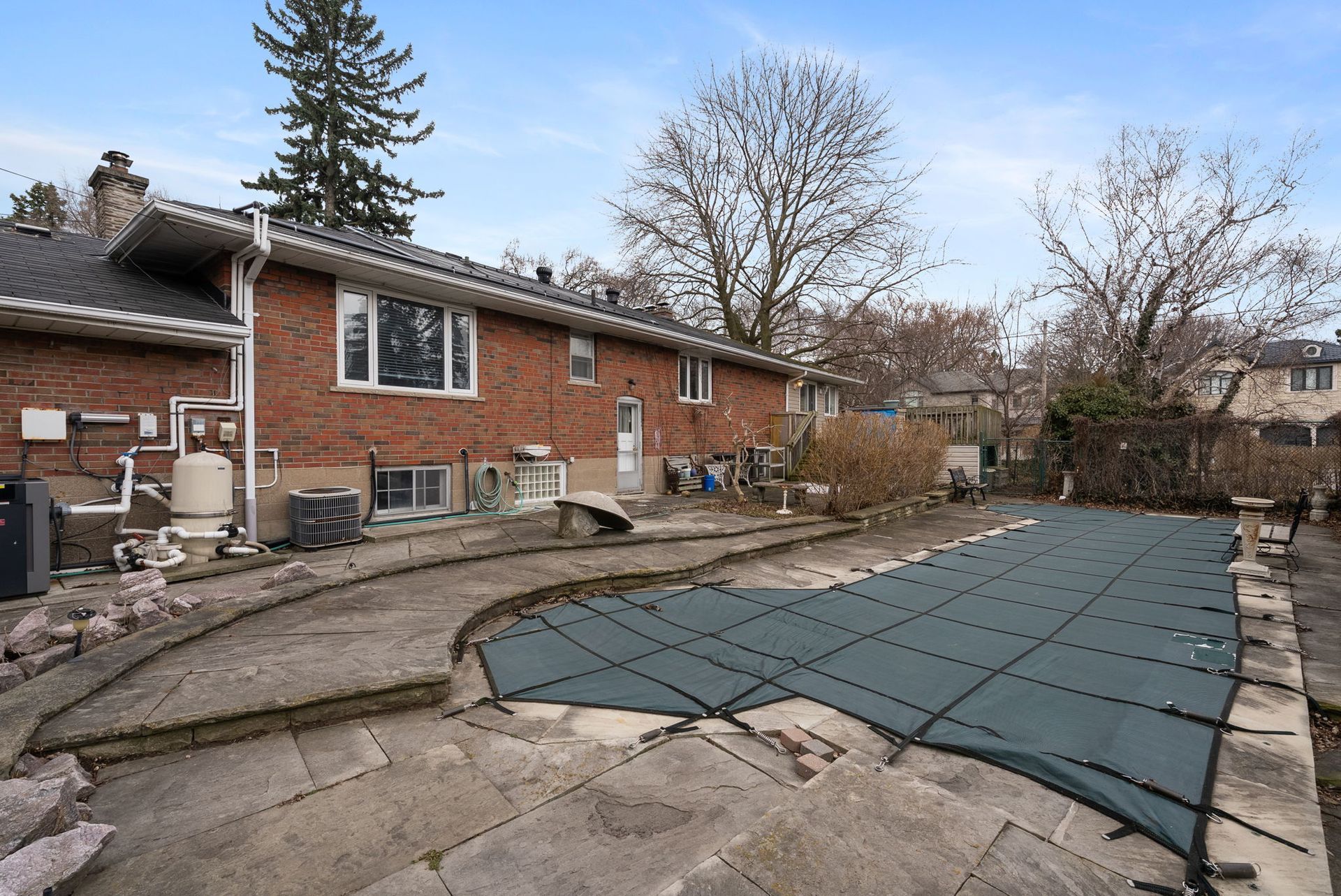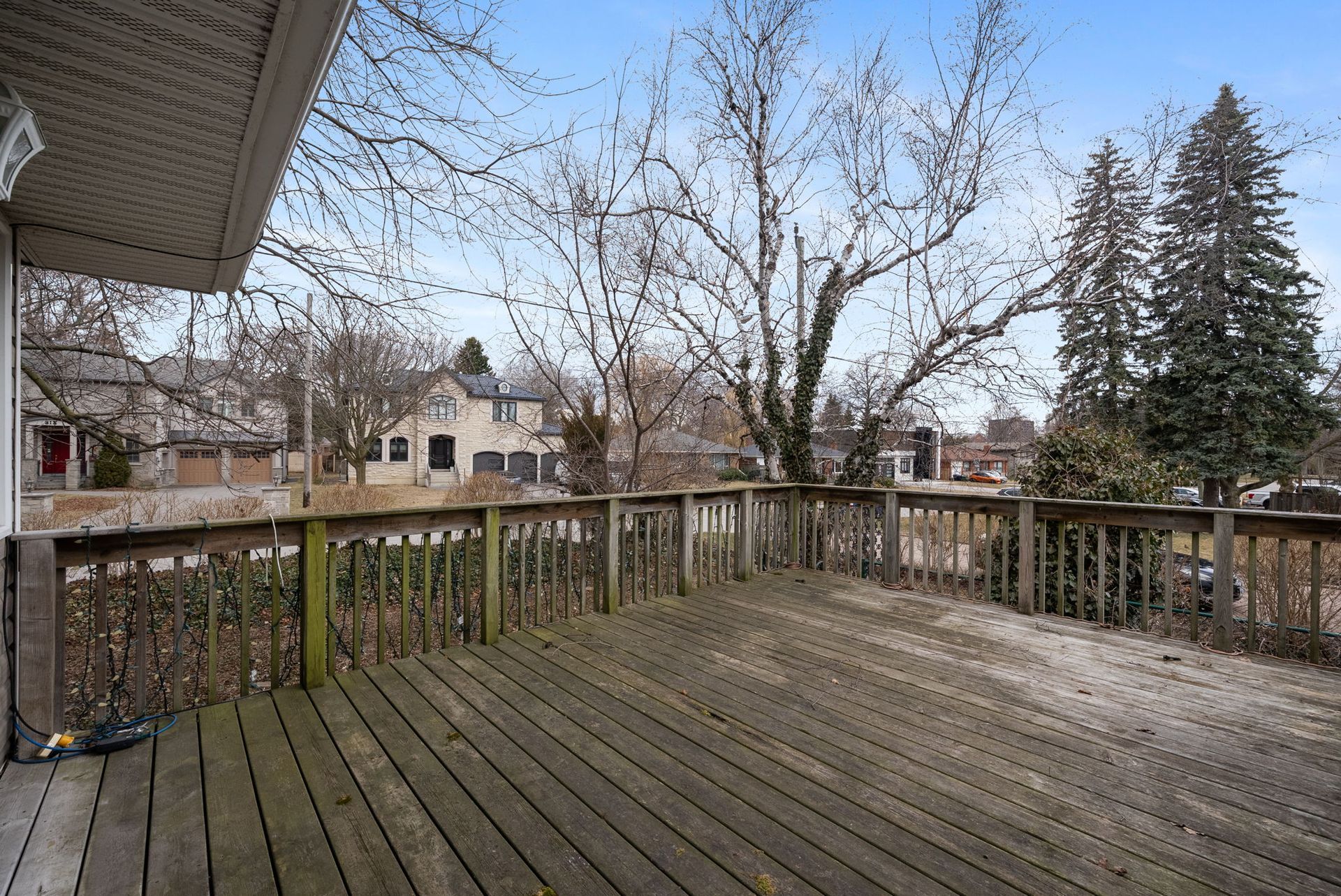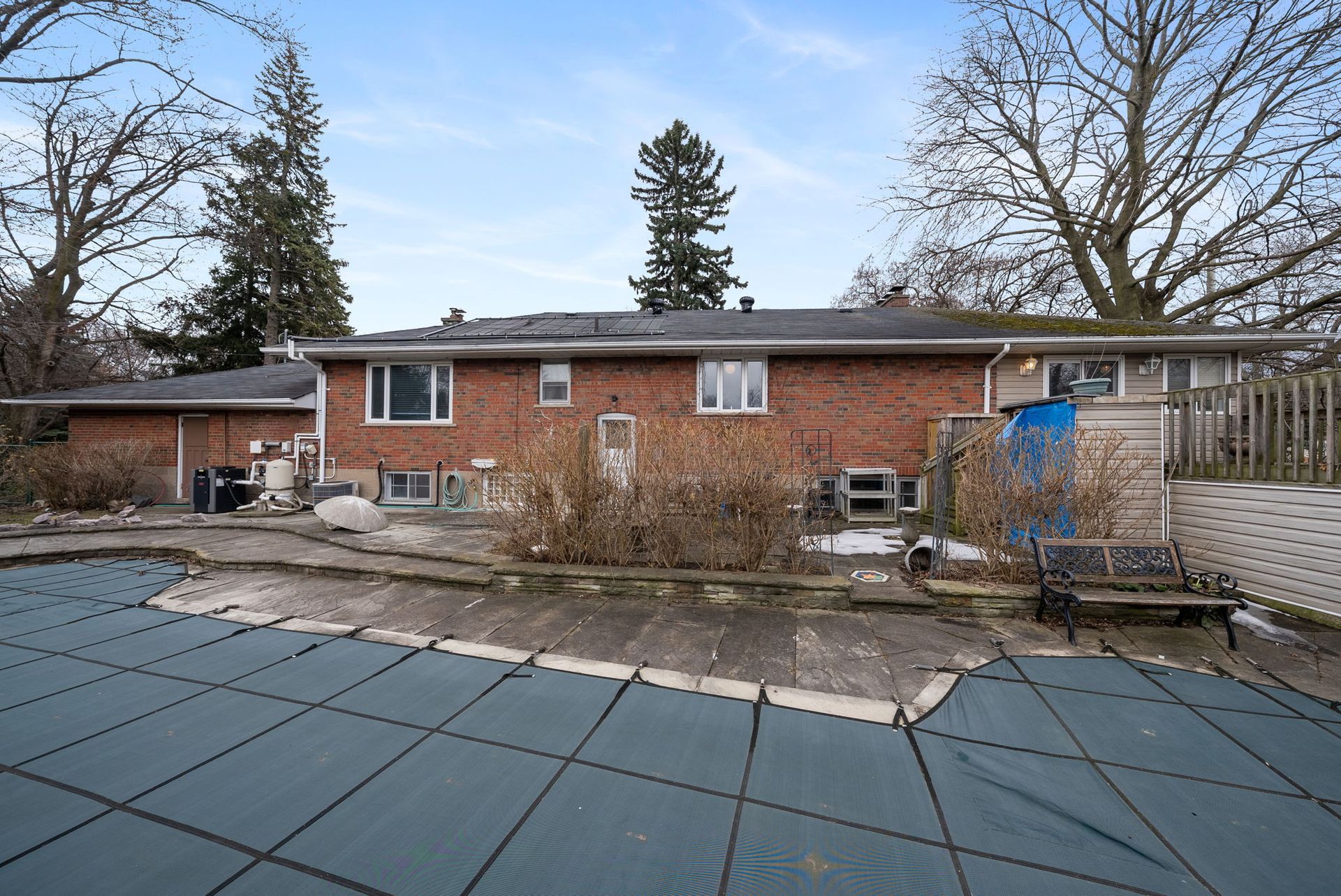 This charming brick bungalow boasts a spacious, traditional layout with large principal rooms filled with natural light. A generous addition extends the living space, offering a walkout to a raised deck overlooking the scenic backyard and inground pool.