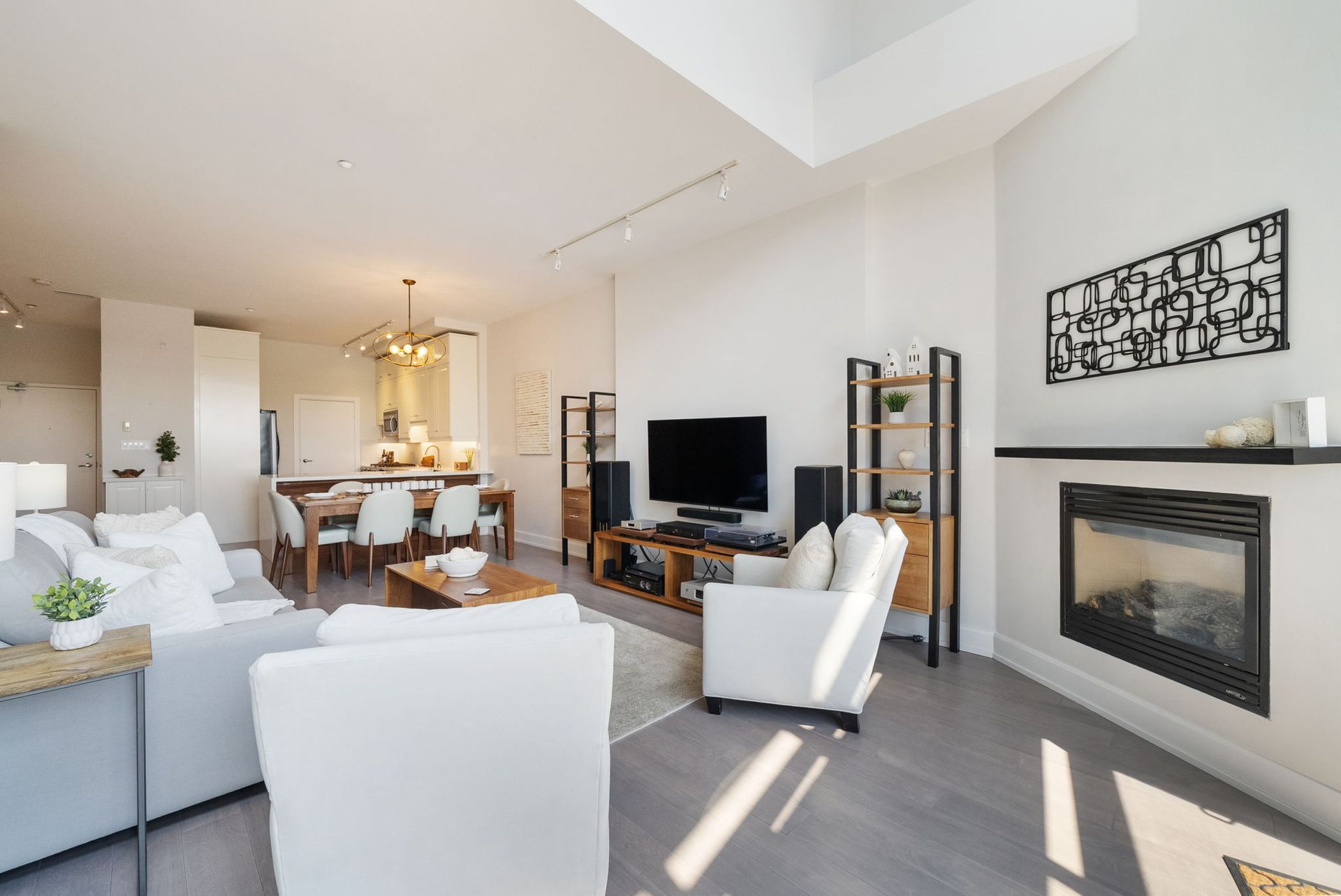 The modern, bright kitchen is a showstopper with its L-shaped quartz countertops, breakfast bar seating, ample storage and pantry space—plus ensuite laundry for everyday ease. The open concept kitchen overlooks the large living room complete with gas fireplace and walkout to your private 144sqft terrace featuring stunning views and a natural gas BBQ hookup.
